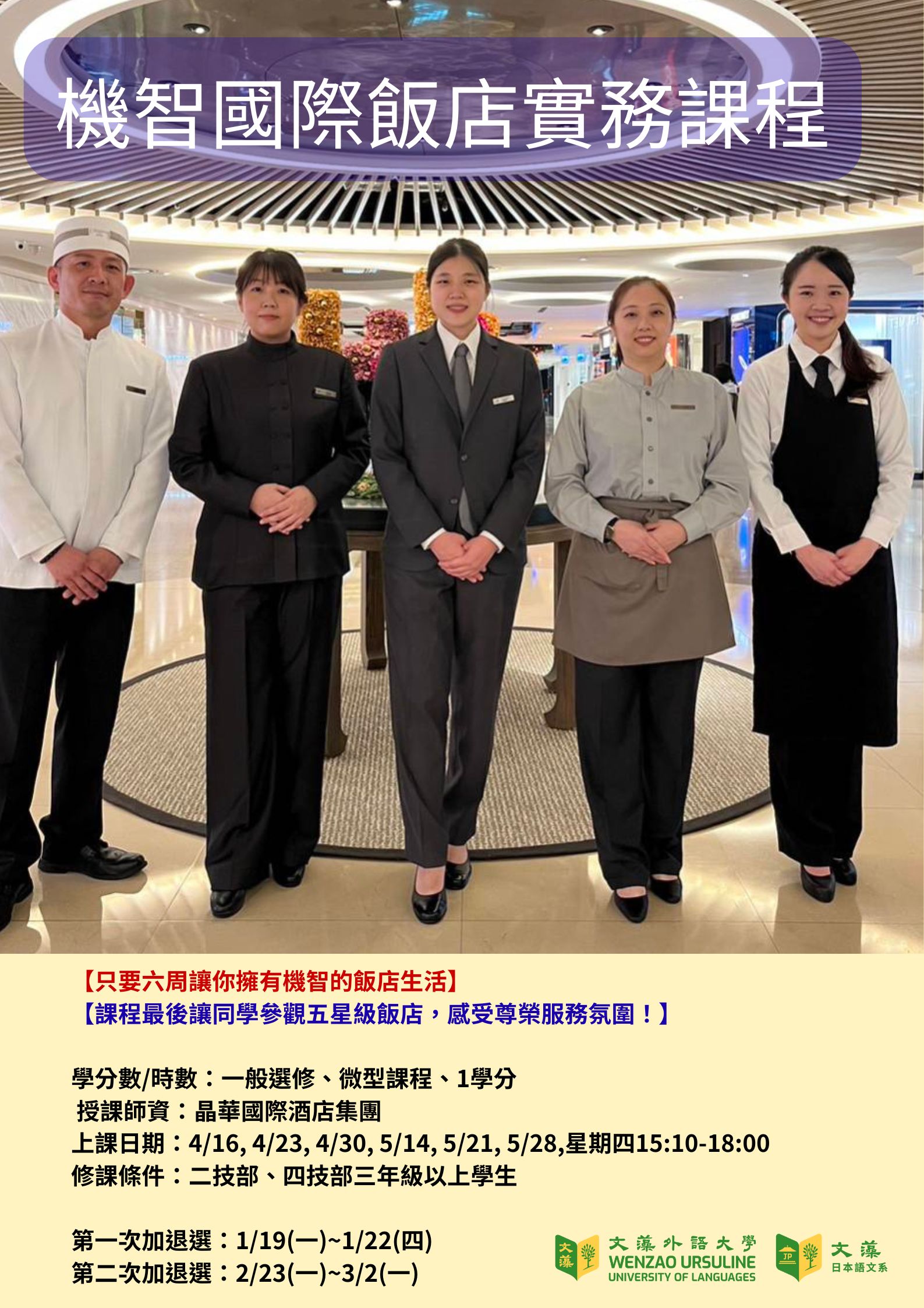 【轉知】【晶華國際酒店集團】「機智的國際飯店實務課程」(114-2學期),歡迎二技部、四技部三年級以上同學選修【選課代碼:0982】